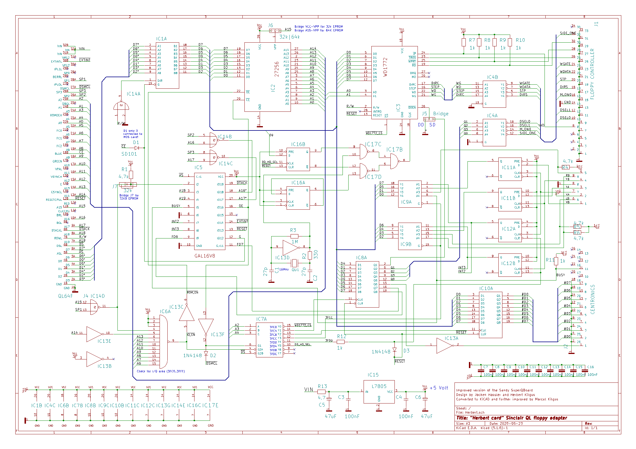 The Herbert card was a re-engineered Sandy SuperQBoard, developed by Jochen Hassler and my late father, Herbert Kilgus (hence the name). That means it features a floppy controller, an (atari-type) mouse connector and a parallel port. Here I present a fully open source version of the board, with the layout updated by me to be HD compatible. Actually I think this is the first released QL floppy controller other than the GoldCards that is capable of supporting HD discs!